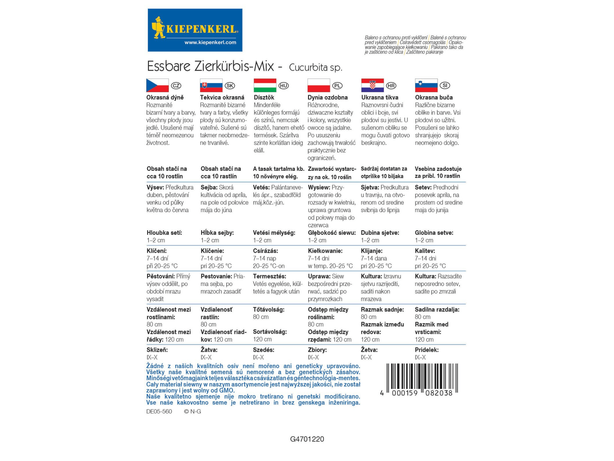 Dynia ozdobna 'Essbare Zierkurbis’ to zestaw różnorodnych jednorocznych odmian, które charakteryzują się bujnym wzrostem, obfitym owocowaniem oraz niezwykłą dekoracyjnością. Produkują owoce o różnych kształtach oraz intensywnych kolorach: żółtych, pomarańczowych, kremowych i zielonych. Stanowią wspaniałą dekorację ogrodową, a po zbiorach można je wykorzystać do tworzenia jesiennych aranżacji. Owoce te są trwałe i wytrzymałe. Dynie mogą być wykorzystywane jako rośliny zadarniające lub pnące. Owoce dyni są jadalne i stanowią doskonałe źródło witamin i minerałów.