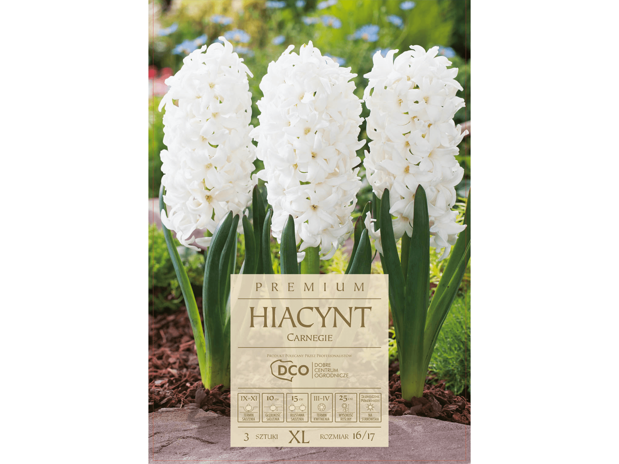 Hiacynt Carnegie to klasyczny, śnieżnobiały hiacynt, o spektakularnych kwiatostanach z dużymi, otwartymi kwiatami, jest ulubioną odmianą do doniczek i pojemników, ale także wspaniałym wyborem do nasadzeń masowych. Wydziela przyjemny słodki zapach. Ceniony ze względu na bujne, piękne kwitnienie, nawet w przypadku roślin znajdujących się kilka lat na tym samym stanowisku.