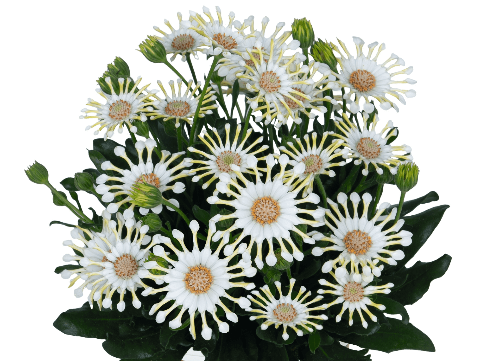 Stokrotka afrykańska ‘Margarita Cream Spoon’ charakteryzuje się biało-kremowymi kwiatami. Kolor może nie wydaje się niezwykły, ale kształt płatków już tak. Przypominają one malutkie łyżeczki, co wygląda naprawdę uroczo i ciekawie. Kwiaty są duże i wyjątkowo liczne. Co ciekawe nie zamykają się na noc i nawet w pochmurne dni. Liście mają lancetowaty kształt, ciemnozielony kolor i ząbkowany brzeg. Pędy są sztywne i dobrze się rozgałęziają, co nadaje roślinie gęsty i wzniesiony pokrój. Osiąga wysokość 20 – 30 cm.