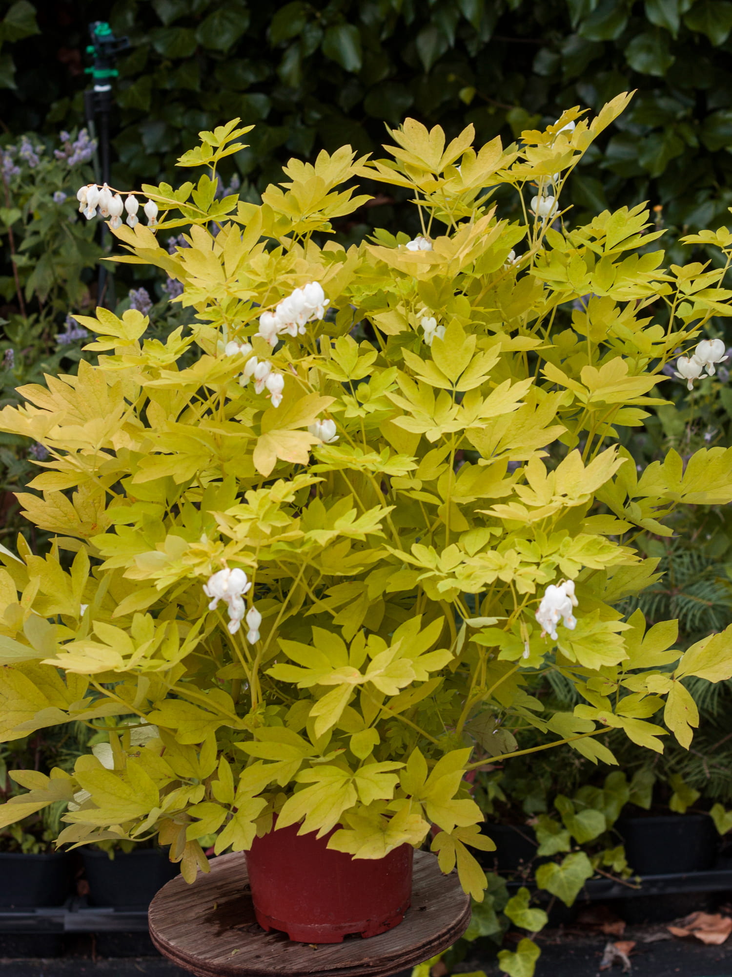 Kwitnienie trwa od maja do czerwca. Kwiaty mają uroczy kształt zwisających z pędu serduszek. Zebrane są w długie, groniaste kwiatostany o niezwykle eleganckim wyglądzie. Białe kwiaty bardzo ciekawie wyglądają na tle złocistego ulistnienia.